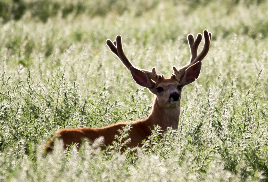 The deer have been hanging out in the hay fields enjoying the first cutting. The Mule deer bucks are growing their new sets of horns in preparation for autumn contests. Now they are all in velvet without the hard, sharp edges and points that will be present in a few months. It is nice seeing them with this more relaxed and laid back attitude.