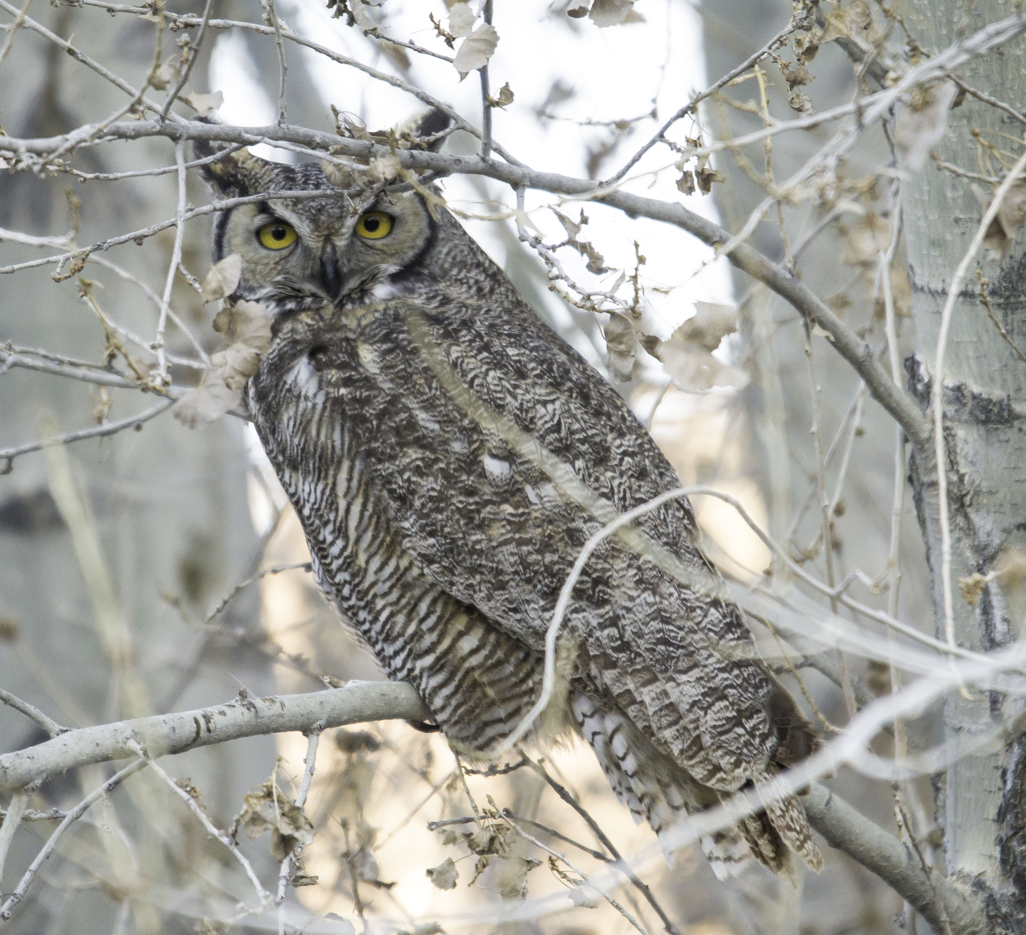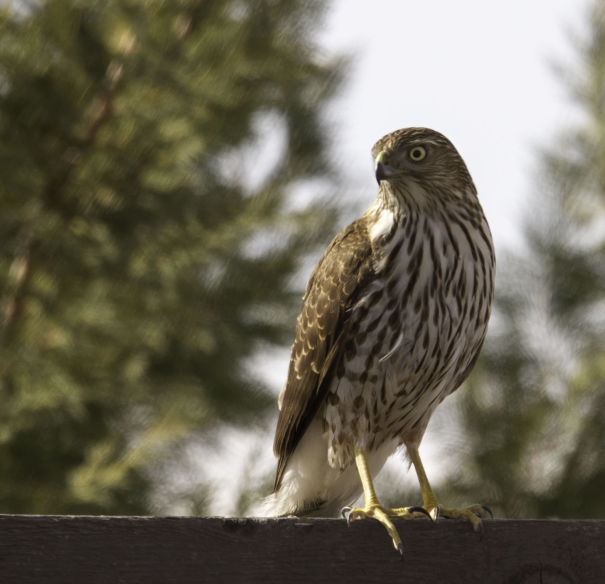 Winter has been bitterly cold here and after not going out for a few weeks I could not stand it anymore. Have made one trip out to the refuge to see if I could stay warm with some new boots and got the pic of the Great Horned Owl. The boots worked pretty well with heat packs in them. Took these pictures yesterday in my back yard. I need to practice for an upcoming trip. I have a camo drape that my Mother was kind enough to make for me. I sit on a little stool with the cloth draped over me. It is amazing how quickly the birds forget that you are there. There is quite a lot of drama in my backyard. I have a feeder set up for the small birds which they have been flocking to. We have at least two hawks that hunt the little birds on a regular basis. It is interesting to watch the hawks. They show up and the little birds all take refuge in bushes that the hawks are too large to get into. The little birds scold and chatter at the hawks from their hiding places. Yesterday this Coopers hawk landed on the fence and watched the birds for a bit allowing me to get photos of him. Then he flew at the bushes until all the birds flew out and he chased them. He was not successful this time but I have observed the Sharp-shinned Hawk eating a sparrow from my weeping cherry tree. Just wish they would snag the pigeons. I feel fortunate to have so much going on right out my back door!