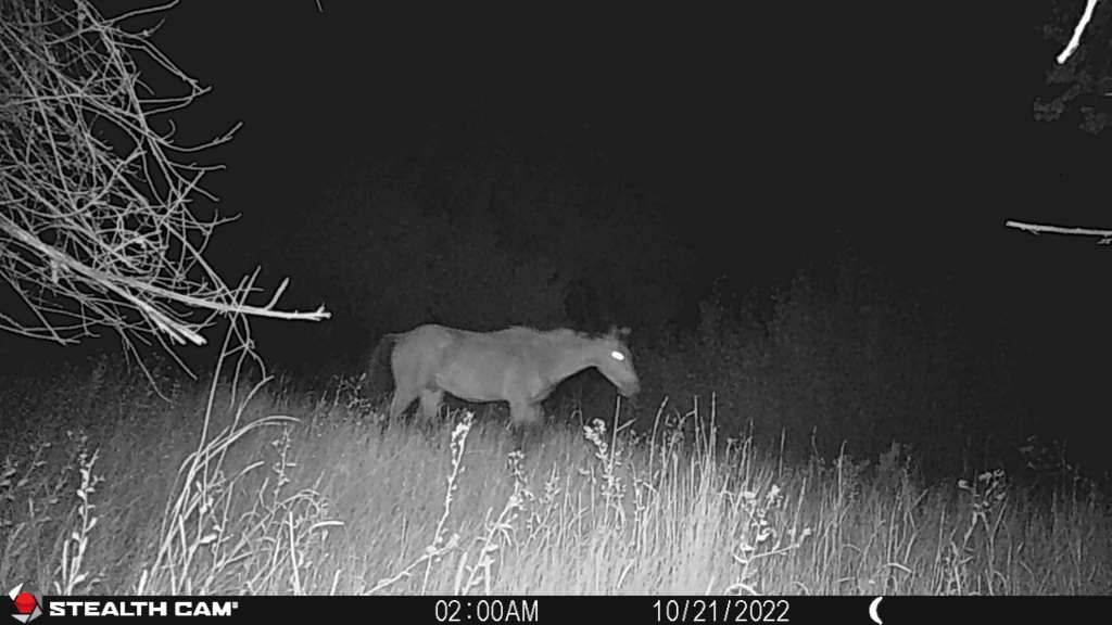 I have always been afraid of the dark. This fear has not gone away even at my advanced age. I just have far too much imagination and can conjure frightening images from the slightest noise or unexplained movement out there in the scary dark. I laugh at myself as even when reviewing trail cam photos that are taken in the dark I can get creeped out. It is disconcerting to stare at a photo that was taken at 2:00 AM and there is nothing obviously in the photo that triggered the flash. Another eerie sight are eyes glowing out of the dark with no hint at what animal or other being is behind the eyes. In these photos the animals are easy to identify, deer, feral horses, coyotes and a raccoon.