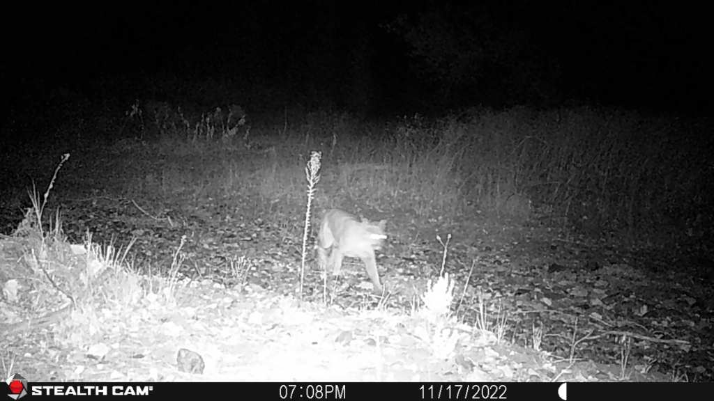 Right on cue, after a bobcat appearance, a lion shows itself. I thought if I saw one this would be the camera that picked one up. It is on a well-traveled route to water. The deer and horses are frequently using this trail so why not a lion? It’s a rocky route without low weeds and brush so the lion is highlighted quite well. Unfortunately, again these photos are at night so not the great photo quality. Still, it is nice to see that they are out there keeping the wild places wild. Thie appears to be a young lion. It looks on the smaller side. I hope to see it again but not in person!