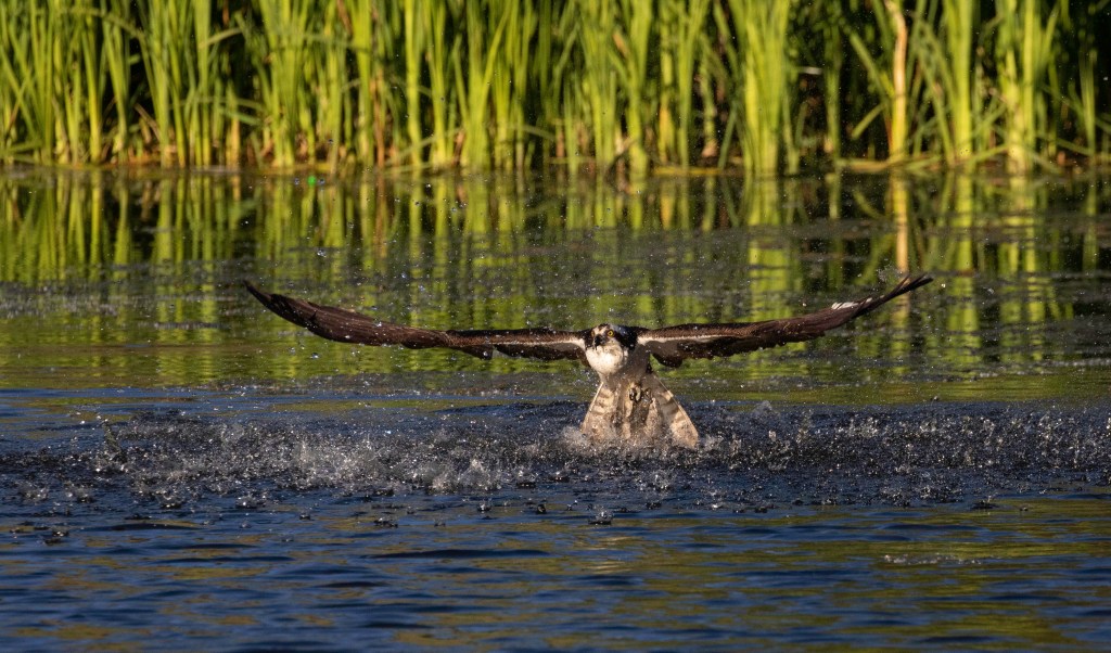 Of course the whole point of the Osprey’s efforts are to come up with a fish! For a few weeks last summer this small pond afforded me numerous opportunities to photograph the Ospreys as they hunted. I sat for hours on the edge of the pond for many days to capture the action. In the following series of photographs you can see the Osprey almost submerged in the water as he/she successfully snags a fish, to the point it flies off with it’s prize.