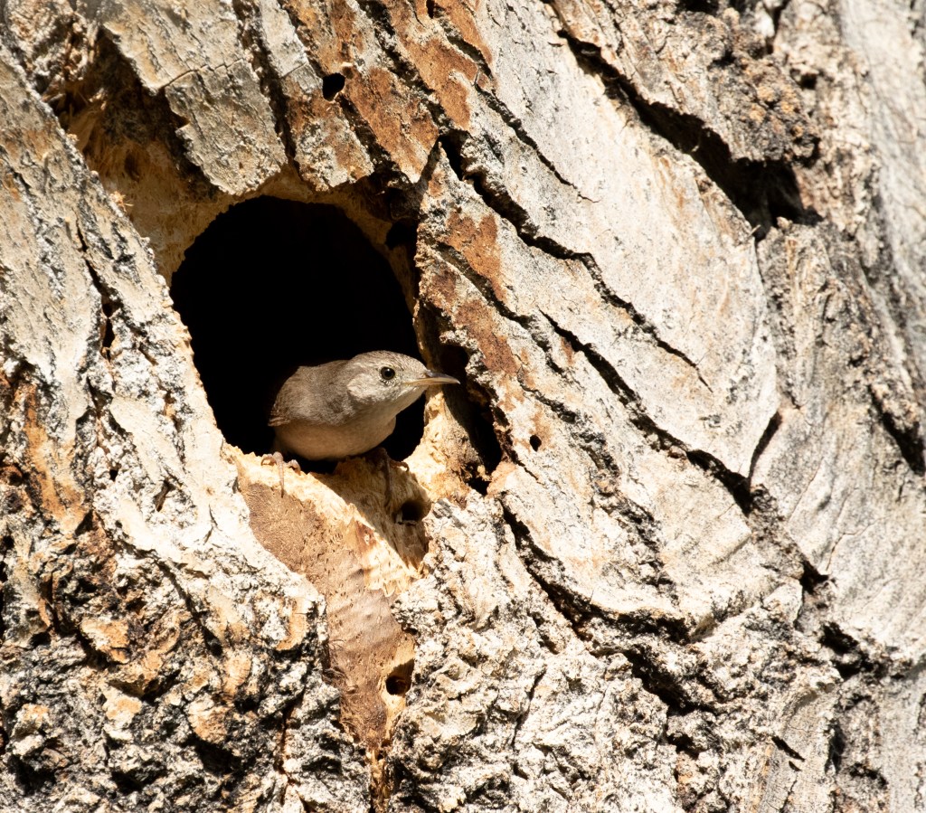 This House Wren and a Northern Flicker seemed to be competing for a hole in a large cottonwood tree. No doubt the Flicker made the hole and the wren was bug hunting inside.