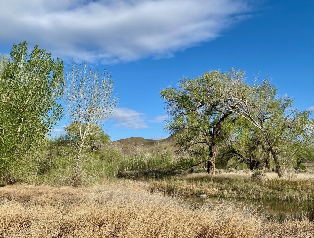 This is a typical landscape of the area I am walking in. The cottonwood trees are getting serious about leafing out now. Small ponds like the one in the foreground are starting to fill up. The river is running fast and full of snow melt from the Sierra Nevada west of here.
