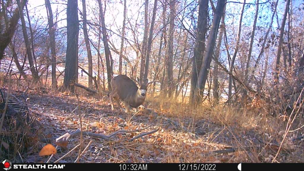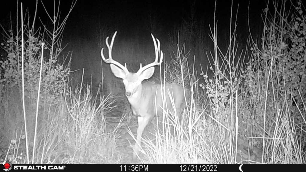 I have lots of photos of Mule Deer bucks from July through December of 2022. I feel like I got to know them well through the photos taken of them on my Trail cameras. It was interesting to watch them the last 6 months. They changed their behavior through the observation time. In the summer they were solitary or hung out with one other buck. I saw some sparring through summer and early fall and then the very serious business of competing for does in November and December. My favorite buck of the year is a classic 4 point western count. He has a large, very symmetrical rack and is in my opinion the handsomest of all the bucks in that area this year. He posed nicely for several photos and I enjoyed going through all his photos to choose a few I’ll show here.