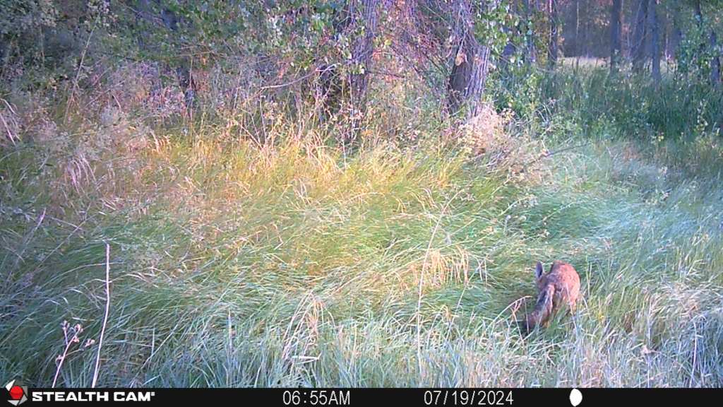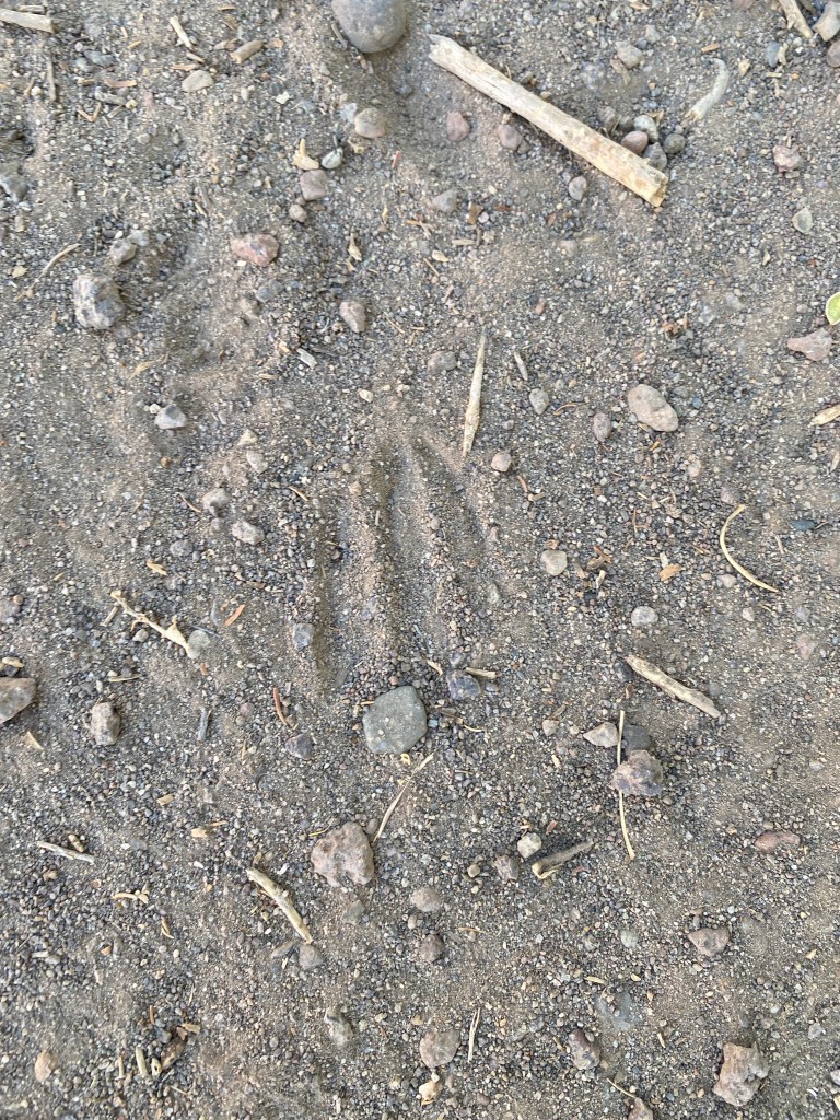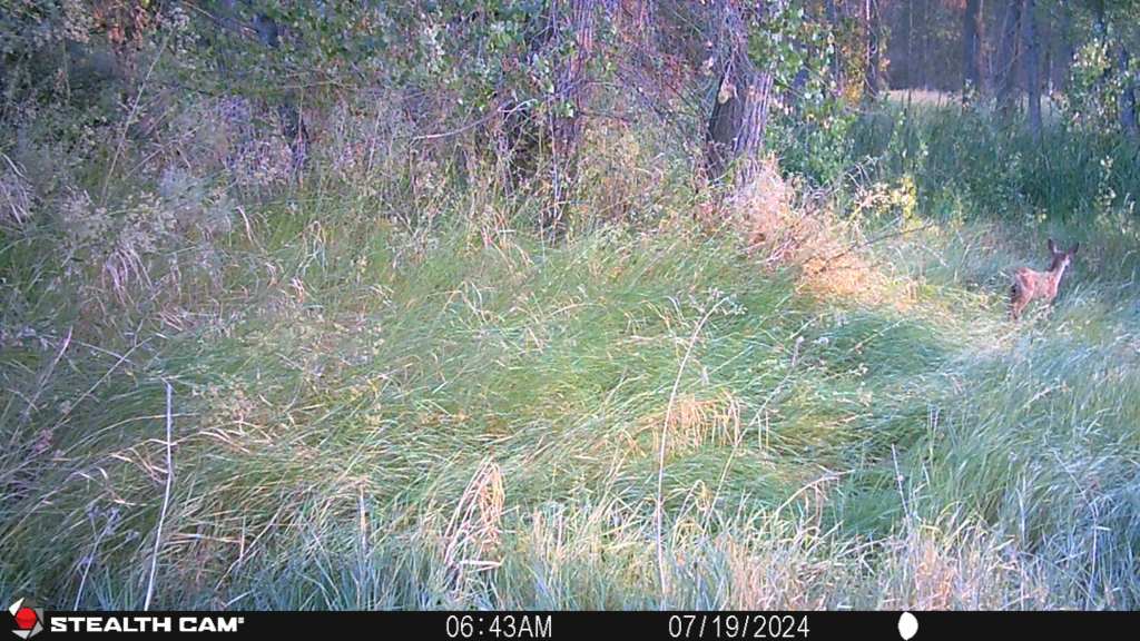 I am remembering why I didn’t leave the cameras out in the summer. It is unpleasant at 90+ degrees to walk out to them and retrieve the memory cards. Also, I forget how lush the grass growth is at the height of summer. Rattlesnakes are constantly on my mind as I tread carefully along the trails to get to the cameras. The sets across the river are going to have to wait as even with an early start its too hot to walk to them and back. Alright, enough complaining. As I walked along the trail yesterday morning I was watching for tracks as usual and spotted my first set of tiny deer hoofs in the dirt.