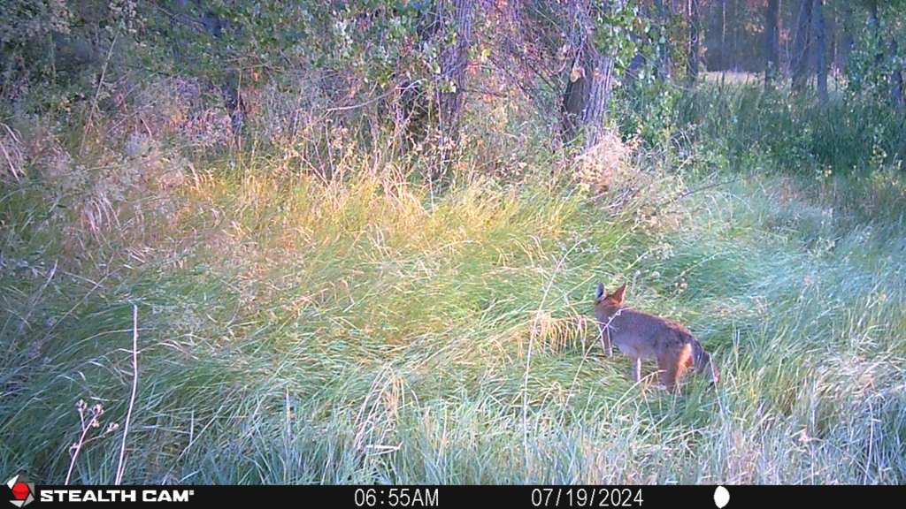 While going through the trail cam photos I noticed what I am going to say was a very close call. A coyote is stalking a mule deer fawn and the mom confronts him. I think this ended happily for the fawn. Lets look at the photos.