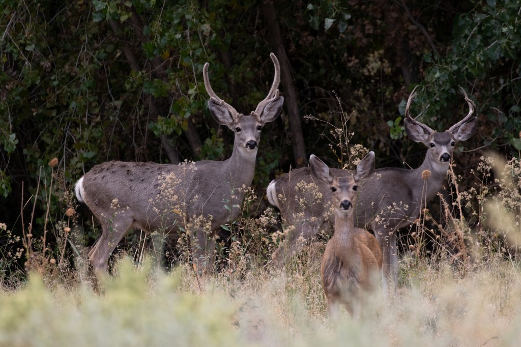 This photo shows how the deer change their coats from summer red to the grey they will wear until spring of next year. The bucks are already in grey, and the doe is transitioning to it in the picture.
